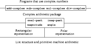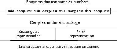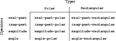 43 In actual computational systems, rectangular form is preferable to polar form most of the time because of roundoff errors in conversion between rectangular and polar form. This is why the complex-number example is unrealistic. Nevertheless, it provides a clear illustration of the design of a system using generic operations and a good introduction to the more substantial systems to be developed later in this chapter.