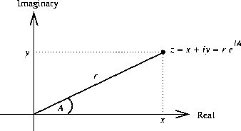 When multiplying complex numbers, it is more natural to think in terms of representing a complex number in polar form, as a magnitude and an angle (r and A in figure 2.20). The product of two complex numbers is the vector obtained by stretching one complex number by the length of the other and then rotating it through the angle of the other: