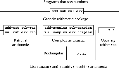 Figure 2.23 shows the structure of the system we shall build. Notice the abstraction barriers. From the perspective of someone using ``numbers,'' there is a single procedure add that operates on whatever numbers are supplied. Add is part of a generic interface that allows the separate ordinary-arithmetic, rational-arithmetic, and complex-arithmetic packages to be accessed uniformly by programs that use numbers. Any individual arithmetic package (such as the complex package) may itself be accessed through generic procedures (such as add-complex) that combine packages designed for different representations (such as rectangular and polar). Moreover, the structure of the system is additive, so that one can design the individual arithmetic packages separately and combine them to produce a generic arithmetic system.