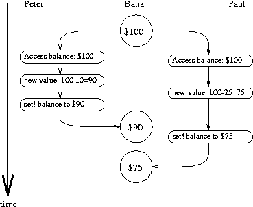 If the two processes operate independently, then Peter might test the balance and attempt to withdraw a legitimate amount. However, Paul might withdraw some funds in between the time that Peter checks the balance and the time Peter completes the withdrawal, thus invalidating Peter's test.