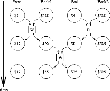One possible restriction on concurrency would stipulate that no two operations that change any shared state variables can occur at the same time. This is an extremely stringent requirement. For distributed banking, it would require the system designer to ensure that only one transaction could proceed at a time. This would be both inefficient and overly conservative. Figure 3.30 shows Peter and Paul sharing a bank account, where Paul has a private account as well. The diagram illustrates two withdrawals from the shared account (one by Peter and one by Paul) and a deposit to Paul's private account.38 The two withdrawals from the shared account must not be concurrent (since both access and update the same account), and Paul's deposit and withdrawal must not be concurrent (since both access and update the amount in Paul's wallet). But there should be no problem permitting Paul's deposit to his private account to proceed concurrently with Peter's withdrawal from the shared account.