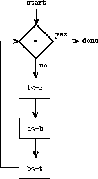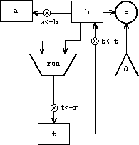 A machine to carry out this algorithm must keep track of two numbers, a and b, so let us assume that these numbers are stored in two registers with those names. The basic operations required are testing whether the contents of register b is zero and computing the remainder of the contents of register a divided by the contents of register b. The remainder operation is a complex process, but assume for the moment that we have a primitive device that computes remainders. On each cycle of the GCD algorithm, the contents of register a must be replaced by the contents of register b, and the contents of b must be replaced by the remainder of the old contents of a divided by the old contents of b. It would be convenient if these replacements could be done simultaneously, but in our model of register machines we will assume that only one register can be assigned a new value at each step. To accomplish the replacements, our machine will use a third ``temporary'' register, which we call t. (First the remainder will be placed in t, then the contents of b will be placed in a, and finally the remainder stored in t will be placed in b.)