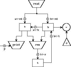 Let us modify the GCD machine so that we can type in the numbers whose GCD we want and get the answer printed at our terminal. We will not discuss how to make a machine that can read and print, but will assume (as we do when we use read and display in Scheme) that they are available as primitive operations.1