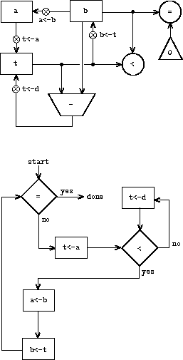 In order for the data paths to actually compute GCDs, the buttons must be pushed in the correct sequence. We will describe this sequence in terms of a controller diagram, as illustrated in figure 5.2. The elements of the controller diagram indicate how the data-path components should be operated. The rectangular boxes in the controller diagram identify data-path buttons to be pushed, and the arrows describe the sequencing from one step to the next. The diamond in the diagram represents a decision. One of the two sequencing arrows will be followed, depending on the value of the data-path test identified in the diamond. We can interpret the controller in terms of a physical analogy: Think of the diagram as a maze in which a marble is rolling. When the marble rolls into a box, it pushes the data-path button that is named by the box. When the marble rolls into a decision node (such as the test for b = 0), it leaves the node on the path determined by the result of the indicated test. Taken together, the data paths and the controller completely describe a machine for computing GCDs. We start the controller (the rolling marble) at the place marked start, after placing numbers in registers a and b. When the controller reaches done, we will find the value of the GCD in register a.