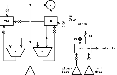 With the aid of the stack, we can reuse a single copy of the factorial machine's data paths for each factorial subproblem. There is a similar design issue in reusing the controller sequence that operates the data paths. To reexecute the factorial computation, the controller cannot simply loop back to the beginning, as with an iterative process, because after solving the (n - 1)! subproblem the machine must still multiply the result by n. The controller must suspend its computation of n!, solve the (n - 1)! subproblem, then continue its computation of n!. This view of the factorial computation suggests the use of the subroutine mechanism described in section 5.1.3, which has the controller use a continue register to transfer to the part of the sequence that solves a subproblem and then continue where it left off on the main problem. We can thus make a factorial subroutine that returns to the entry point stored in the continue register. Around each subroutine call, we save and restore continue just as we do the n register, since each ``level'' of the factorial computation will use the same continue register. That is, the factorial subroutine must put a new value in continue when it calls itself for a subproblem, but it will need the old value in order to return to the place that called it to solve a subproblem.