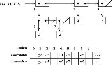 We can use vectors to implement the basic pair structures required for a list-structured memory. Let us imagine that computer memory is divided into two vectors: the-cars and the-cdrs. We will represent list structure as follows: A pointer to a pair is an index into the two vectors. The car of the pair is the entry in the-cars with the designated index, and the cdr of the pair is the entry in the-cdrs with the designated index. We also need a representation for objects other than pairs (such as numbers and symbols) and a way to distinguish one kind of data from another. There are many methods of accomplishing this, but they all reduce to using typed pointers, that is, to extending the notion of ``pointer'' to include information on data type.7 The data type enables the system to distinguish a pointer to a pair (which consists of the ``pair'' data type and an index into the memory vectors) from pointers to other kinds of data (which consist of some other data type and whatever is being used to represent data of that type). Two data objects are considered to be the same (eq?) if their pointers are identical.8 Figure 5.14 illustrates the use of this method to represent the list ((1 2) 3 4), whose box-and-pointer diagram is also shown. We use letter prefixes to denote the data-type information. Thus, a pointer to the pair with index 5 is denoted p5, the empty list is denoted by the pointer e0, and a pointer to the number 4 is denoted n4. In the box-and-pointer diagram, we have indicated at the lower left of each pair the vector index that specifies where the car and cdr of the pair are stored. The blank locations in the-cars and the-cdrs may contain parts of other list structures (not of interest here).