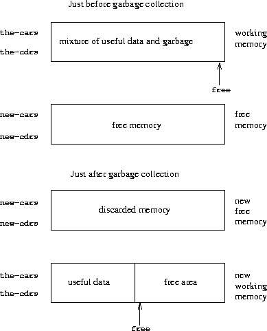 There are many ways to perform garbage collection. The method we shall examine here is called stop-and-copy. The basic idea is to divide memory into two halves: ``working memory'' and ``free memory.'' When cons constructs pairs, it allocates these in working memory. When working memory is full, we perform garbage collection by locating all the useful pairs in working memory and copying these into consecutive locations in free memory. (The useful pairs are located by tracing all the car and cdr pointers, starting with the machine registers.) Since we do not copy the garbage, there will presumably be additional free memory that we can use to allocate new pairs. In addition, nothing in the working memory is needed, since all the useful pairs in it have been copied. Thus, if we interchange the roles of working memory and free memory, we can continue processing; new pairs will be allocated in the new working memory (which was the old free memory). When this is full, we can copy the useful pairs into the new free memory (which was the old working memory).15