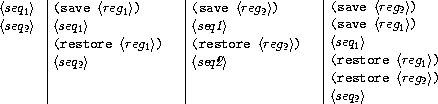 Whenever registers might need to be saved, the compiler's code generators use preserving, which is a more subtle method for combining instruction sequences. Preserving takes three arguments: a set of registers and two instruction sequences that are to be executed sequentially. It appends the sequences in such a way that the contents of each register in the set is preserved over the execution of the first sequence, if this is needed for the execution of the second sequence. That is, if the first sequence modifies the register and the second sequence actually needs the register's original contents, then preserving wraps a save and a restore of the register around the first sequence before appending the sequences. Otherwise, preserving simply returns the appended instruction sequences. Thus, for example,
